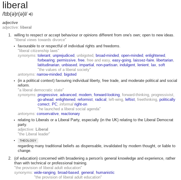 Not to be pedantic, but because the word liberal is used quite loosely and sometimes even pejoratively, it’s important to bring us all on the same page with what it really means. Being a polysemic word, Google’s dictionary feature (which has licensed Oxford Dictionaries for this feature) gives multiple meanings for the word liberal. The ones that I am interested have been reproduced below in the image below: