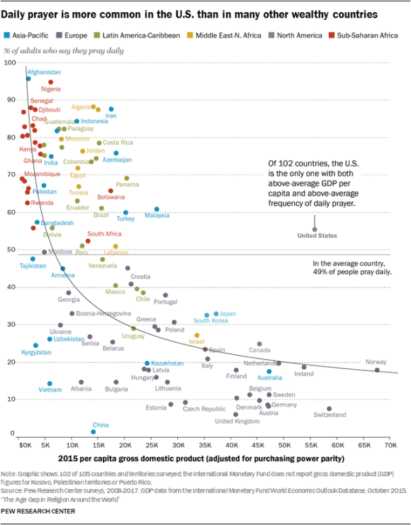 Of course, correlation is not causation. So religiosity can’t be assumed as the reason for their low PCIs, although it may be a contributing factor (with the country’s politics, economics, education the more important reasons). But what this data shows for sure is that as nations grow rich, their people tend to get less religious. This points to the claim that the poor are religious because they don’t see any other option options to meet their lights, any other way to find the proverbial light for themselves. For the masses, religion and religious practice is not a choice, or a way of living that they like, but something that they believe they must have to do otherwise bad things will happen to them, which is quite ironic given their underprivileged status. When superstitions, blind faith and religious authorities force them to undertake tasks, spend money or their time on rather “fruitless” tasks, then it remains an issue. The right kind of critical-thinking and exposure based education can be an antidote that helps everyone see things differently (not unlike what I mentioned earlier). The silver lining to this “dark” cloud is that based on this trend of religiosity decreasing with increasing prosperity, the future should see much lesser “evil” influence of religion over as the countries get richer (unless catastrophe strikes and we end with a dystopia instead of reaching towards an utopia).